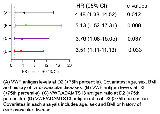 - Wibowo, A.; Pranata, R.; Lim, M.A.; Akbara, M.R.; Martha, J.W. Endotheliopathy marked by high von Willebrand factor (vWF) antigen in COVID-19 is associated with poor outcome: A systematic review and meta-analysis. Int. J. Infect. Dis. 2022, 117, 267–273. [Google Scholar] [CrossRef]