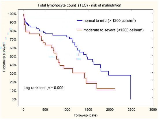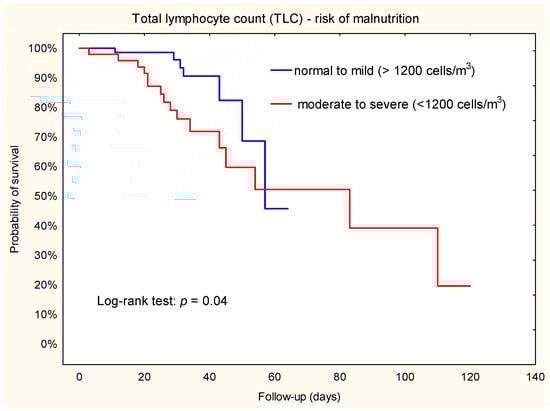 Total lymphocyte count (TLC) and serum albumin are reliable nutritional indices []. In our study, the prevalence of a moderate-severe risk of malnutrition according to TLC was observed in 40% of patients. In a study evaluating TLC and albumin in surgical patients, malnutrition was higher than in our study (73.9% by TLC). In contrast, Tojek et al. reported in a retrospective analysis of 54,976 patients that a TLC < 0.8 G/L occurred in 15% of patients [].