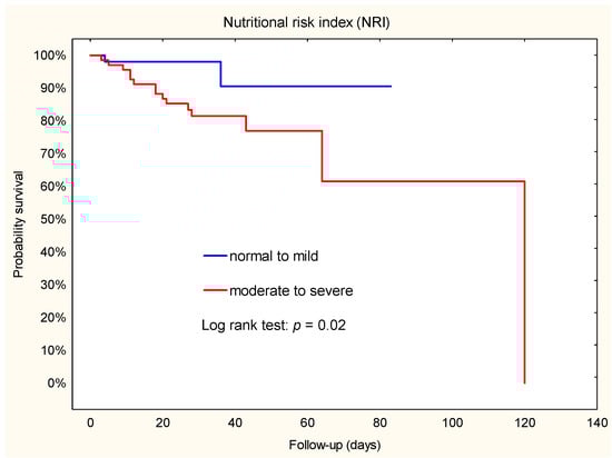 The NRI is an index based on ideal body weight that aims to represent body weight and serum albumin levels. The NRI was calculated as (1.5 × serum albumin [g/L] + 41.7 × [current body weight]). A patient with an NRI of >100 is considered in the no-risk group, 97.5–100—mild risk, 83.5–97.5—moderate risk, and <83.5—severe risk. An NRI calculator is available (https://www.mdcalc.com/calc/4012/nutrition-risk-screening-2002-nrs-2002, accessed on 30 September 2023) [].
