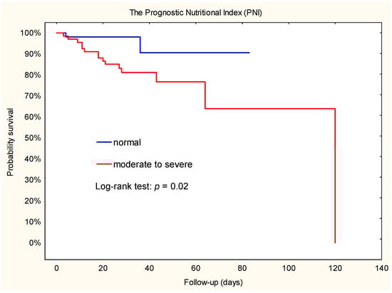The PNI was calculated as (10 × serum albumin (g/dL) + 0.005 × total lymphocytes (1000/μL)). A score < 30 indicates severe malnutrition, PNI > 38 is normal, and 35–38 indicates a moderate risk of malnutrition [].