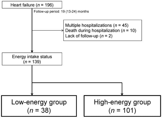 There were no significant differences in readmission rates due to worsening HF between the two groups (the low-energy group and the high-energy group). The background of the patients enrolled in this study was approximately the same. Although there were no significant differences in age or NYHA classification/BNP/Hb levels/renal function at discharge between the two groups, both groups were very old, had low LVEF and poor renal function, and were hospitalized approximately two times on average for HF exacerbations. The patients in this study were considered to have late stage C to stage D HF and were more likely to have acute exacerbations of chronic HF due to factors other than energy intake, which would have resulted in a higher rehospitalization rate [38]. Therefore, we consider that the rehospitalization rate was not significantly different between the two groups.