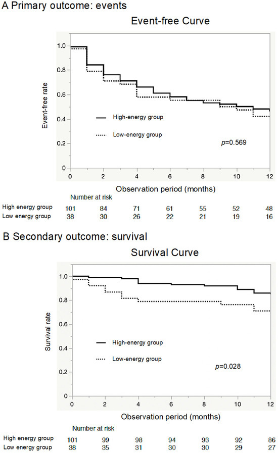 The Kaplan–Meier (KM) curve of the primary outcome showed that the two groups had equivalent event rates (p = 0.569) (Figure 2A). On the other hand, the KM curve of all-cause death demonstrated a worse prognosis in the low-energy group than in the high-energy group (p = 0.028, Figure 2B), although the two groups showed equivalent readmission rates (p = 0.403, Figure 2C).