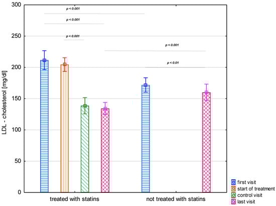 LDL lipoprotein cholesterol levels in the study group stratified by statin treatment.