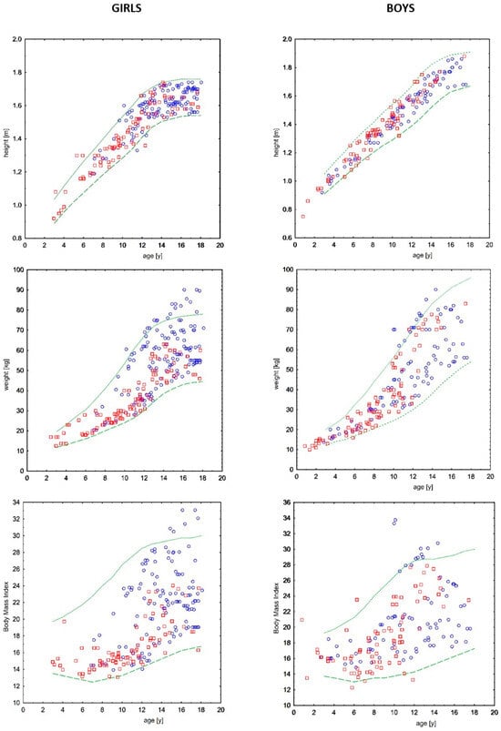 The distribution of body weight, height, and BMI of the male and female participants in relation to the standard reference is shown in Figure 2 (3rd and 97th centile according to OLAF) []. The body height remained within normal limits. There were no deficiencies in body weight throughout the follow-up period. The summary data presented in the graph revealed a higher prevalence of weight above the age standard (97th centile) in older children, more prevalent among girls, and more frequent among children treated with statins. The prevalence of obesity, defined as a BMI above the 97th percentile, was found less frequently but still more often among older, mainly female children and those treated with statins.