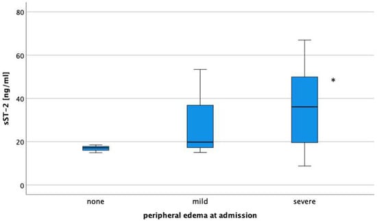 Median concentration of sST2 in patients with none, mild, and severe peripheral edema at the time of hospital admission. * p = 0.040.