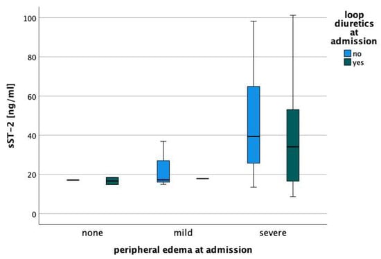 Overall, median sST2 concentration at admission was 35.2 (17.2–46.7) ng/mL. sST2 concentrations differed depending on the severity of peripheral edema (p = 0.040; Figure 1). The pattern was essentially unchanged in patients already on loop diuretics at admission compared to those who were not (Figure 2).