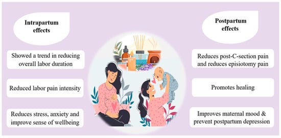 According to Liao et al. [104], aroma’s beneficial effects extend beyond labor pain, as summarized in Figure 4.