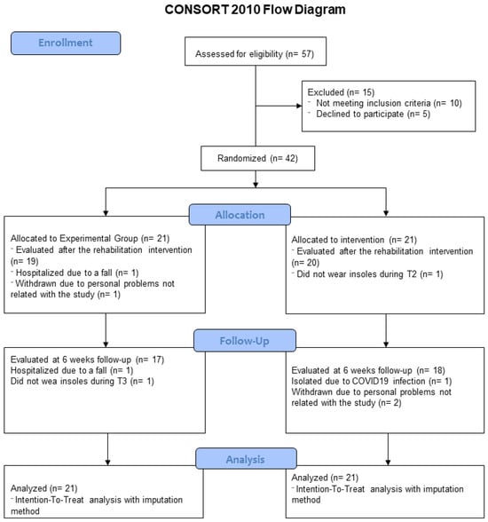 The study’s sample size was calculated a priori using the primary outcome, TUG, with G*Power 3.1 software. Two degrees of freedom, a power (1 − β) of 80%, an α = 5%, a minimum clinically important difference of 3.5 s [], and a standard deviation of 3.7 s [] were used for a two-way analysis of variance (ANOVA). The results were incremented by 20% to prevent problems due to eventual dropouts; a number of 21 subjects per group (42 subjects in total) was retrieved.