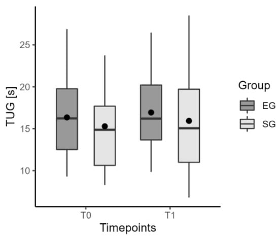 The values of median, mean, and quartiles of TUG time in EG and SG for the long-term effect.