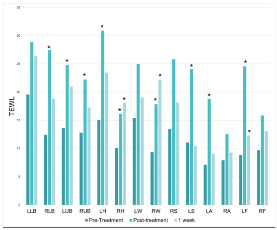 Transepidermal Water Loss (TEWL) baseline, immediately following treatment and one week following treatment. * = p < 0.05.