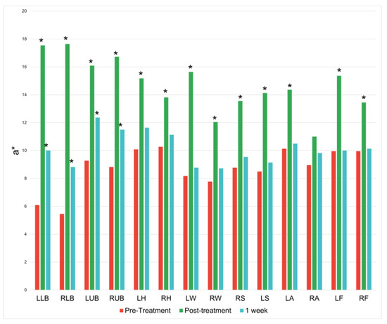 Changes along the red/green coordinate (a*) at baseline, immediately following treatment, and one week following treatment. * = p < 0.05.