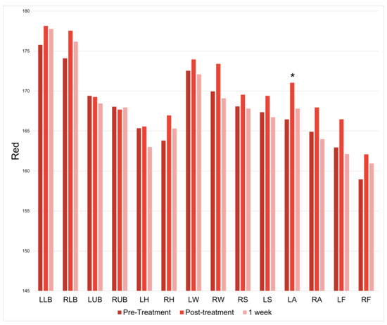 Red at baseline, immediately following treatment, and one week following treatment. * = p < 0.05.