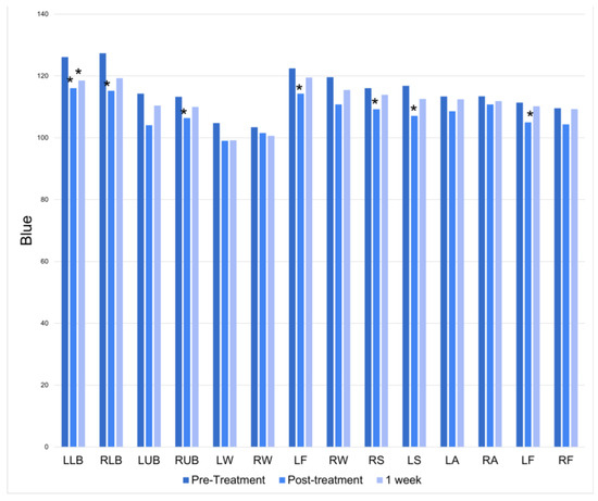 There was a significant increase in blue at half of the treatment locations immediately following the treatment session. At the 1-week follow-up, only the left lower back had a persistently significant increase in blue (Figure 5).