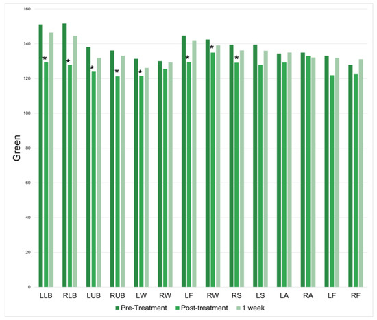There was a significant increase in green at 11 of the 14 treatment locations immediately following the treatment session. However, this change was not found at the 1-week follow-up (Figure 6).
