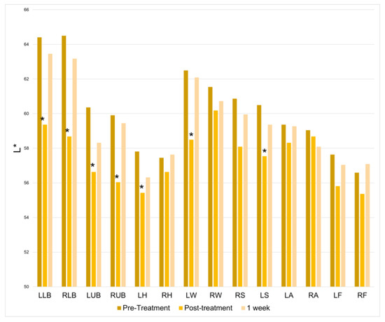 Lightness from black to white (L*) at baseline, immediately following treatment, and one week following treatment. * = p < 0.05.