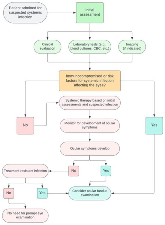 To date, comprehensive data on the implications of ocular fundus examinations for inpatients with systemic infections remain sparse, especially in terms of understanding its diagnostic efficacy, impact on treatment modifications, and ultimate contribution to patient outcomes in a hospital setting. Further retrospective studies examining historical patient data could shed light on the clinical trajectories of inpatients undergoing fundus examination versus those who were not during systemic infections. Specifically, such studies might elucidate differences in morbidity, intervention timeliness, and overall patient survival. Although prospective studies could solidify the present evidence, initiating such research could pose several ethical issues, particularly when it involves potentially withholding necessary ophthalmological consultations. Instead, more nuanced research designs, perhaps observational in nature, could be pursued. Nevertheless, the decision tree presented here can be effectively employed in developing countries, with appropriate adaptations, where the incidence of infectious diseases is high. Ocular fundus examination is an affordable and low-resource diagnostic tool that could be especially beneficial in areas where diseases such as HIV are prevalent []. Requiring minimal equipment, it is accessible for bedside use even in settings with limited healthcare infrastructure. Training healthcare workers in these regions to conduct and interpret ocular fundus examinations could aid in the timely detection and treatment of systemic conditions, potentially even more so than in countries where more costly diagnostic examinations are readily available.