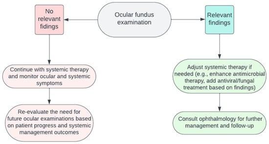 The utility of ocular fundus examination in guiding patient management is a nuanced topic. In the context of bacterial infections, detecting ocular involvement might suggest a systemic dissemination of the infection. Yet, conventional treatments for bacterial infections typically involve broad-spectrum antibiotics. These medications would inherently address bacterial pathogens impacting the eye. Therefore, the presence of ocular involvement might not substantially alter the foundational approach to treating bacterial infections. However, if the systemic infection is controlled, prompt treatment of the eye is crucial. Early intervention can help prevent potential vision loss, underscoring the significance of considering targeted eye therapies in such cases, such as performing aqueous/vitreous taps for antibiograms or contemplating intravitreal antibiotic injections []. Concerning some viral infections such as CMV, ocular changes can be instrumental in dictating treatment modalities. Detecting CMV retinitis, particularly in immunocompromised individuals, could necessitate the introduction or adjustment of specific antiviral agents. This finding may also underscore the importance of evaluating and addressing the patient’s overall immunological status []. A flowchart about patient management after ocular fundus examination is shown in Figure 3, and it emphasizes an interdisciplinary methodology that integrates diagnostic insights with the broader clinical picture to optimize patient outcomes.