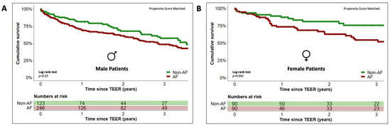 | Variable | No AF (n = 123) | AF (n = 391) | p-Value | No AF (n = 90) | AF (n = 217) | p-Value |