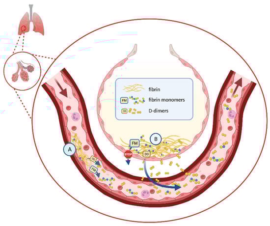 Distinction between D-dimers (DD) with a low MW allowing extravasation (A and B) and a fibrin monomer (FM) with a high MW (A); MW: molecular weight; A: intravascular area; B: extravascular area (pulmonary alveolar). (Created with Biorender.com, accessed on 31 October 2023).