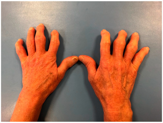 - Erre, G.L.; Marongiu, A.; Fenu, P.; Faedda, R.; Masala, A.; Sanna, M.; Soro, G.; Tocco, A.; Piu, D.; Marotto, D.; et al. The “sclerodermic hand”: A radiological and clinical study. Jt. Bone Spine 2008, 75, 426–431. [Google Scholar] [CrossRef] [PubMed]