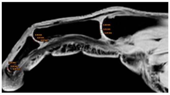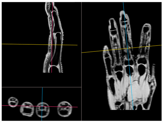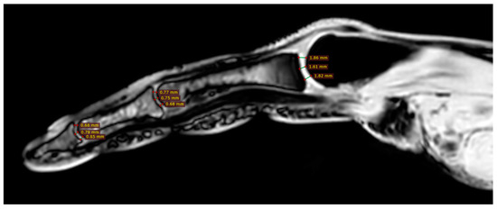 All participants were examined with the three-dimensional quantitative MRI (3D q-MRI). The Philips 3T scanner was used with the coil for small parts. After obtaining structural T1 and T2 scans, the WATS 3D sequence was performed. The WATS sequence is dedicated to the cartilage evaluation and highlights the subchondral cortical layer. Due to the application of a 3D sequence, we were able to obtain the true sagittal cross-section of each finger (Figure 3). This was vital because, in some patients, contractions did not allow for anatomical position of fingers during examination. After adjusting the planes, we measured the distance between two cortical layers for each finger joint in its middle transverse dimension, obtaining three measurements (in volar 1/3, dorsal 1/3, and middle 1/3) and calculating a mean (Figure 4 and Figure 5). The distal phalanx length (DPL), the cartilage thickness of distal interphalangeal joints (DIPJ), proximal interphalangeal joints (PIPJ), interphalangeal joint (IPJ), and metacarpophalangeal joints (MCPJ) in all participants were measured.