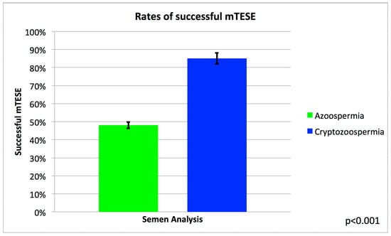 A bar graph demonstrating the rates of successful micro-testicular sperm extraction (mTESE) between males with azoospermia compared to cryptozoospermia.