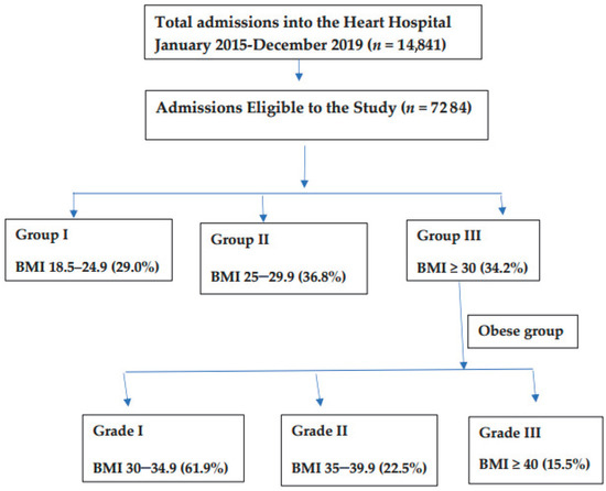 Study population and data: The study included all adult male and female patients admitted to the cardiology department with BMI documented on admission. Patients with incomplete cardiac or BMI data were excluded. Obesity was defined according to the World Health Organization criteria [24]. After fulfilling the inclusion criteria, patients were divided into three groups according to BMI: Group I, normal weight (18.5–24.9 kg/m2); Group II, overweight (25–29.9 kg/m2); and Group III, obese (≥30 kg/m2). The obese group was further divided into three grades: Grade 1 (30–34.9 kg/m2), Grade 2 (35–39.9 kg/m2), and Grade 3 (≥40 kg/m2) [24]. Subgroup analysis of the obese cohort (III) was performed to study obesity grades based on presentation, diagnosis, and in-hospital outcomes.