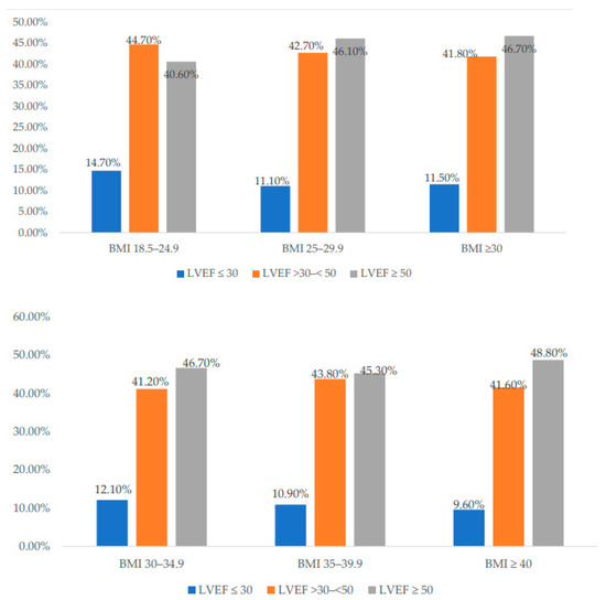 Left ventricular ejection fraction (LVEF) based on body mass index (BMI) in the cohort (upper panel) and the obese groups (lower panel).