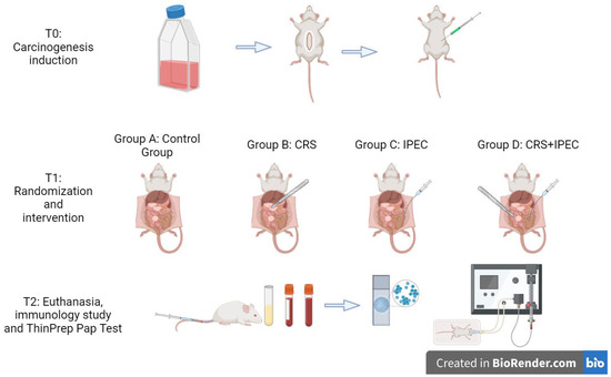 After observation for 28 days, at T2 (Day 56), blood sample collection was performed for an immunology study (IL-6, TNF-α) after anesthesia was administered. Animals were sacrificed by means of CO2 inhalation for further investigations. Then, midline laparotomy was performed and ascites was harvested for the cytological study. In case of premature death of a rat, the time and cause of death were registered, and then laparotomy and measurements followed. An overview of the experimental setup is presented in Figure 1.