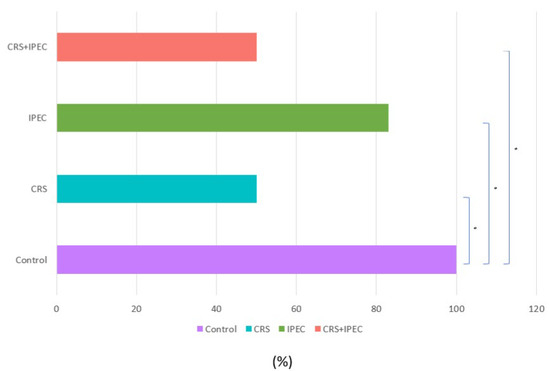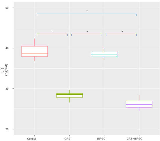 Serum IL-6 levels at T2 (Day 56) (asterisks indicate significant differences). Carcinogenesis induction was performed at T0 (Day 0). After 28 days (T1-Day 28), rats were allocated randomly into 4 groups (group A: control group; group B: CRS only; group C: IPEC only; group D: CRS + IPEC). Regorafenib (10 mg/kg) was used as an IPEC agent. Fifty-six days after carcinogenesis, blood samples were collected for IL-6 level measurement. The confidence interval was set at 95%, which means that the differences between the groups were considered statistically significant when p < 0.05. * p < 0.05.