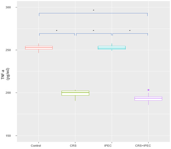 Serum TNF-a levels at T2 (Day 56) (asterisks indicate significant differences). Carcinogenesis induction was performed at T0 (Day 0). After 28 days (T1-Day 28), rats were allocated randomly into 4 groups (group A: control group; group B: CRS only; group C: IPEC only; group D: CRS + IPEC). Regorafenib (10 mg/kg) was used as an IPEC agent. Fifty-six days after carcinogenesis, blood samples were collected for TNF-a level measurement. The confidence interval was set at 95%, which means that the differences between the groups were considered statistically significant when p < 0.05. * p < 0.05.