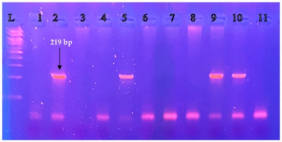 Electrophoresis of PCR products on agarose gel 3% (120 V/45 min) from the study group Lane 2, 5, 9, 10: GSTM1 gene (wildtype), Lane 1, 3, 4, 6, 7, 8, 11: GSTM1-null genotype (deletion), Lane L: DNA ladder (100–1000 bp).