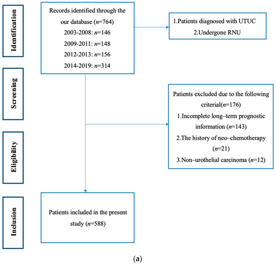 Our study was approved by the Ethics Committee on Biomedical Research, West China Hospital of Sichuan University (2021–1209), and the informed consent was allowed to be waived because of the retrospective nature, anonymous patients, and data. We retrospectively collected UTUC patients who had undergone RNU between May 2003 and June 2019 in the West China Hospital of Sichuan University. We excluded those with incomplete long-term prognostic information, those with non-urothelial carcinoma confirmed by RNU pathology, and we also excluded those who had a previous neoadjuvant therapy history. Ultimately, 588 patients were eligible for inclusion in further analysis (Figure 1a).