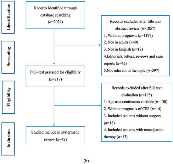 Population, intervention, comparison, outcomes, and study (PICOS) principles were used during the screening process [9], where PICOS stands for: population (P)—patients diagnosed with UTUC; intervention (I)—RNU surgery; comparison (C)—octogenarians and younger patients; outcomes (O)—cancer-specific mortality and CSS; and study designs (S)—retrospective comparative studies. The exclusion criteria were as follows: (a) age was regarded as a continuous variable; (b) not all patients had received RNU; (c) included patients with neoadjuvant therapy; and (d) there was no specific information on CSS. The specific screening flow chart is shown in Figure 1b.