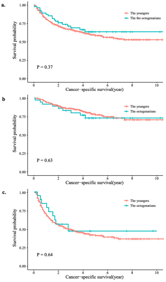 The median follow-up time was 59 months (IQR: 32–83). During this period, 220 (37.4%) patients died from UTUC. The Kaplan–Meier plots showed that, compared with the younger group, the patients in the octogenarian group showed no significant difference in CSS (p = 0.37) (Figure 2a). Similar results were also found in the subgroup analysis of tumor stage (p = 0.63 for pT < 3; p = 0.64 for pT ≥ 3) (Figure 2b,c).