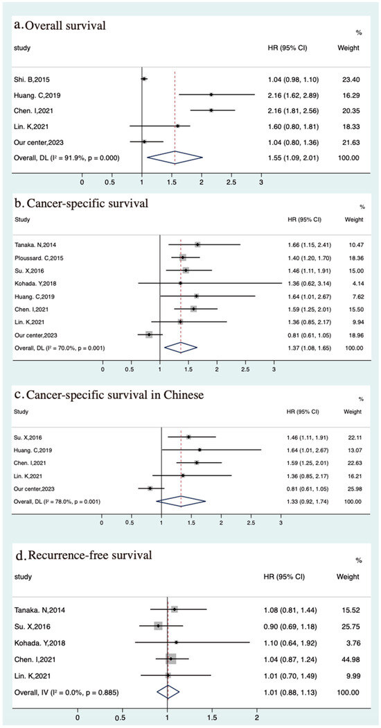 Data on the association between the age of 70 and OS and CSS were available from 5 and 10, respectively. For OS, one study conducted by Kuo et al. was excluded because of the similar publication year and institution, and the same region. In our center, age greater than 70 was not a significantly adverse factor for OS for UTUC patients after RNU (HR 1.04, 95% CI 0.80–1.36), which was also used for pooled analysis. High heterogeneity (p < 0.001, I2 = 91.9%) was observed among the five studies. Therefore, the pooled effect value of OS (pooled HR 1.55, 95% CI 1.29–2.01) was calculated using a random-effects model (Figure 3a).