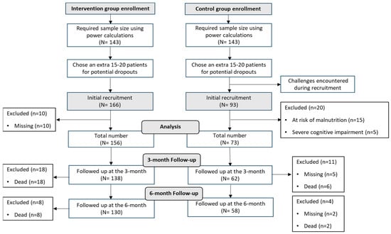 On the other hand, the control group started with an initial recruitment of 93 patients. Out of these, 20 patients were excluded: 15 due to being at risk of malnutrition and 5 due to severe cognitive impairment. This left 73 patients as the final number for the control group. Within this group, at the 3-month follow-up, there were 5 patients who could not be located for assessment and 6 patients who had deceased. By the 6-month follow-up, an additional 2 patients were lost to follow-up, and 2 more had passed away.