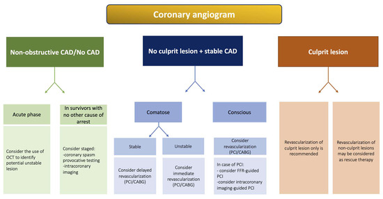 In patients resuscitated from OHCA without an identified culprit lesion on the coronary angiography but with significant obstructive disease with angiographically stable appearance, experts from the European Association for Percutaneous Cardiovascular Interventions (EAPCI) and Stent for Life (SFL) groups have proposed practical guidelines for revascularization even though the cause–effect relationship with cardiac arrest is unclear [32]. In comatose patients with uncertain neurological prognosis, the consensus proposes a management strategy based on hemodynamic status. In hemodynamically unstable patients, PCI of obviously obstructive “stable” lesion(s) should be performed only as a rescue therapy [56]. On the contrary, in hemodynamically stable patients, the decision for revascularization should be delayed and planned according to neurological status (i.e., no or minimal neurological sequalae). Finally, when non-obstructive CAD or no CAD has been found, a search for other causes of cardiac arrest is indicated. In survivors with favorable neurological evolution and no other obvious cause of arrest, a coronary artery spasm provocation test may be performed during a second CAG by an experienced operator using either acetylcholine or ergonovine [57]. A proposed algorithm for the management of OHCA with stable CAD is depicted in Figure 2.