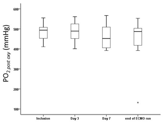 The mean post-oxygenator PO2 was 472 ± 65 mmHg during the study. Concerning membrane oxygenator efficiency, we did not observe a significant decrease in PO2 post oxy during the ECMO run except for one patient with PO2 post oxy at 132 mmHg after 21 days with the same membrane oxygenator, whereas PO2 post oxy at inclusion was 506 mmHg (Figure 1).