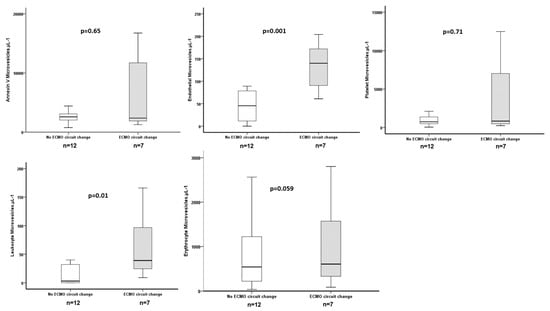 Levels of total MVs and MVs subpopulations at inclusion and need for an ECMO circuit change.