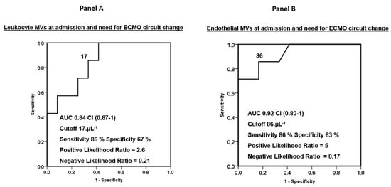 ROC curves for leukocyte (panel (A)) and endothelial (panel (B)) MVs measured at admission and need for an ECMO circuit change.