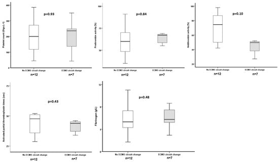 Comparisons of usual coagulation parameters measured at inclusion and need for an ECMO circuit change during the ECMO run.