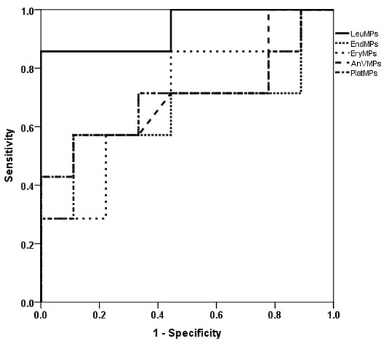 ROC curves for total MVs and subpopulations measured at admission and risk of death. LeuMVs AUC 0.94 CI (0.81–1), p = 0.001 vs. 0.5. cutoff 33 µL−1; sensitivity 87%, specificity 100%, LR+ = 87, LR− = 0.13.