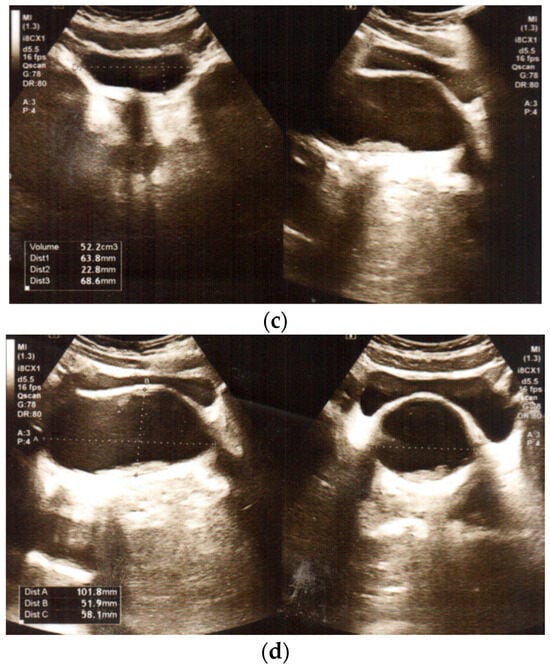 Transabdominal pelvic ultrasound at the time of diagnosis: (a,b) duplication of uterus: uterus with right-sided oval hypoechogenic structure, and normal ovaries (c,d) duplication of vagina, with haematocolpos on the right side.