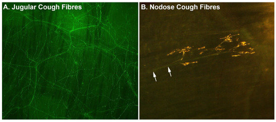 Examples of (A) jugular and (B) nodose cough-evoking nerve fibres in the trachea. Images show representative stains of nerve fibres viewed from the luminal surface in tissue wholemounts collected from guinea pigs. Jugular cough neurons form a dense subepithelial plexus, with fibre branches extending between epithelial cells all the way to the luminal surface. By contrast, nodose cough mechanosensors are sparse and characteristically display a distinct parent axon (arrows), which ramifies into a complex subepithelial nerve ending. Comparable structures have been identified in human airways.