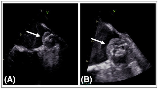 Device related thrombosis. (A,B) 2D TEE of the LA after LAAO and visualization of device related thrombosis on the atrial surface of the WATCHMAN™ device (white arrows). TEE transesophageal echocardiography, LA left atrium, LAAO left atrial appendage occlusion.