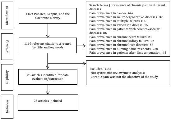 In total, out of the 25 included studies, we included 4 that reported pain in cancer patients [16,17,26,31]; 7 that reported pain in neurodegenerative diseases including amyotrophic lateral sclerosis (ALS), multiple sclerosis, Parkinson’s disease, Huntington’s disease, and dementia [20,21,22,23,24,25,40]; 2 that reported pain in cerebrovascular diseases [38,39]; 1 that reported pain in chronic heart failure (CHF) [28]; 4 that reported pain in chronic kidney disease (CKD) [32,33,34,35], 1 that reported pain in traumatic brain injury (TBI) [37]; 2 that reported pain in COPD [29,30]; 1 that reported pain in chronic liver diseases [36]; 2 that reported pain in nursing home residents and seniors [18,27]; and 1 that reported pain in chronic pain after limb amputation [19].