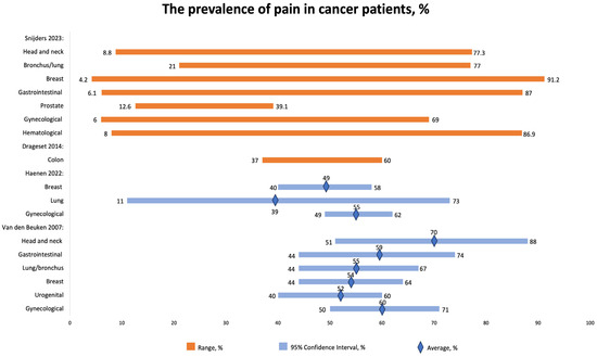 Van den Beuken-van Everdingen et al. (2007) [31] also reported the prevalence of pain in patients with different types of cancers, including head and neck cancer (70% (51–88)), GI tract (59% (44–74)), lung/bronchus (55% (44–67)), breast (54% (44–64)), urogenital (52% (40–60)), and gynecological (60% (50–71%)).