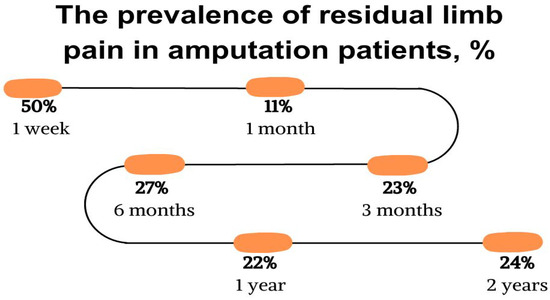 The pain occurs despite attempts to control it with different analgesic methods. From three months to two years, the prevalence of residual limb pain ranges between 22% and 27% (Figure 4). Individuals with amputations due to cancer often report the highest pain severity. It should also be noted that the reported pain severity is generally higher in individuals undergoing upper extremity amputations compared to lower extremity amputations, but this may be influenced by an increased presence of cancer or trauma in the studies involving upper extremity amputations [19].
