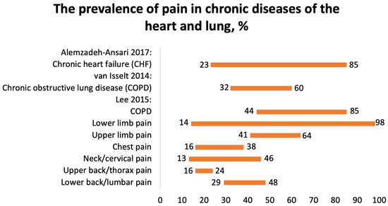 One systematic review, conducted by Alemzadeh-Ansari (2017), reported the prevalence of pain in patients with chronic heart failure (CHF) [28]. The prevalence of pain in 20,875 patients with CHF varied from 23 to 85% (Figure 6). The most commonly reported types of pain were chest pain and neuropathic pain. The mechanisms of pain included ischemia, inflammation, ascites, and constipation [28].
